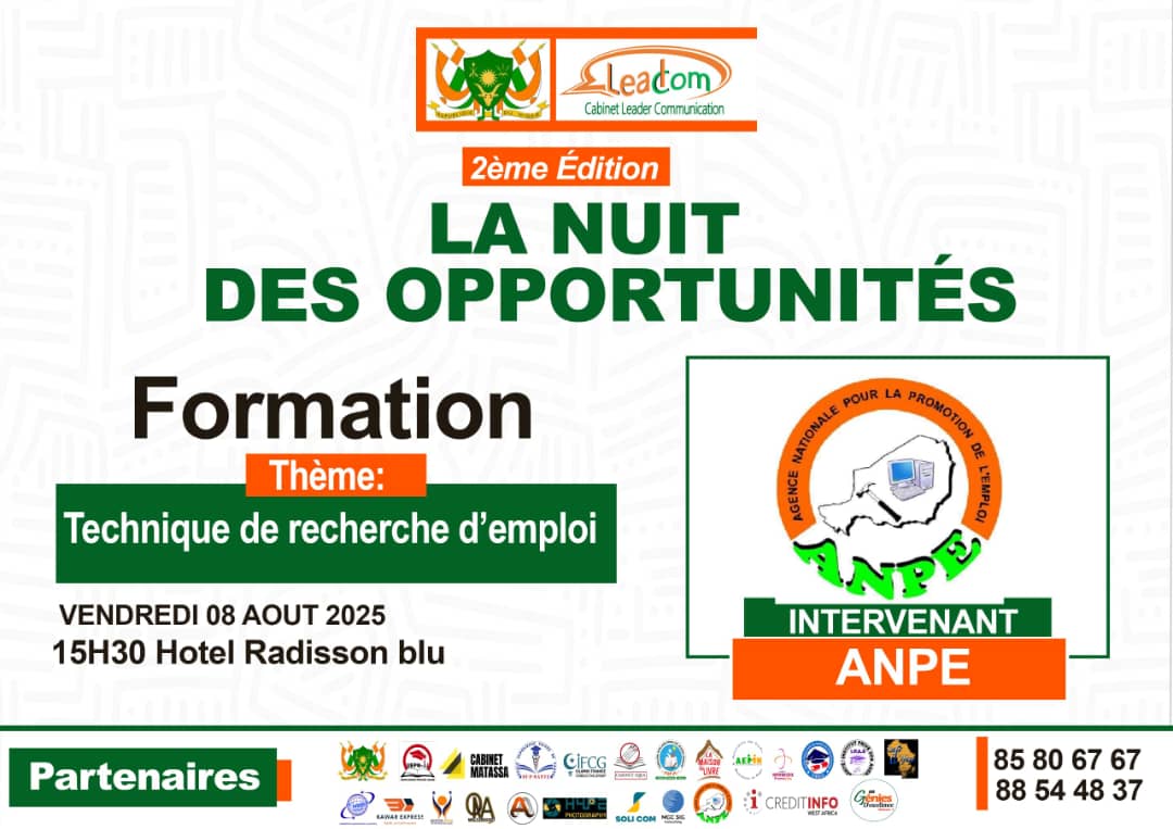 Dans le cadre de la 2ème édition de Nuit des Opportunités, les experts de l’Agence Nationale pour la Promotion de l’Emploi (ANPE) animeront une formation pratique et inspirante sur :📌 Les techniques de recherche d’emploi📌 Comment réussir ses entretiens ?📌 Valoriser son profil et se démarquer sur le marché du travail🗓️ Date : Vendredi 08 août 2025🕒 Heure : 15h30📍 Lieu : HÔTEL RADISSON BLU